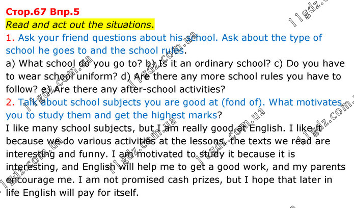 Read and act out the situations. 1. Ask your friend questions about his school. Ask about the type of school he goes to and the school rules. a) What school do you go to? b) Is it an ordinary school? c) Do you have to wear school uniform? d) Are there any more school rules you have to follow? e) Are there any after-school activities? 2. Talk about school subjects you are good at (fond of). What motivates you to study them and get the highest marks? І like many school subjects, but I am really good at English. I like it because we do various activities at the lessons, the texts we read are interesting and funny. I am motivated to study it because it is interesting, and English will help me to get a good work, and my parents encourage me. I am not promised cash prizes, but I hope that later in life English will pay for itself.