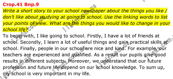 Write a short story to your school newspaper about the things you like / don’t like about studying at going to school. Use the linking words to list your points of view. What are the things you would like to change in your school life? To begin with, I like going to school. Firstly, I have a lot of friends at school. Secondly, I learn a lot of useful things and gain practical skills at school. Finally, people in our school are nice and kind. For example, our teachers are experienced and qualified. As a result our pupils give good results in different subjects. Moreover, we understand that our future profession and future life depend on our school knowledge. To sum up, my school is very important in my life.