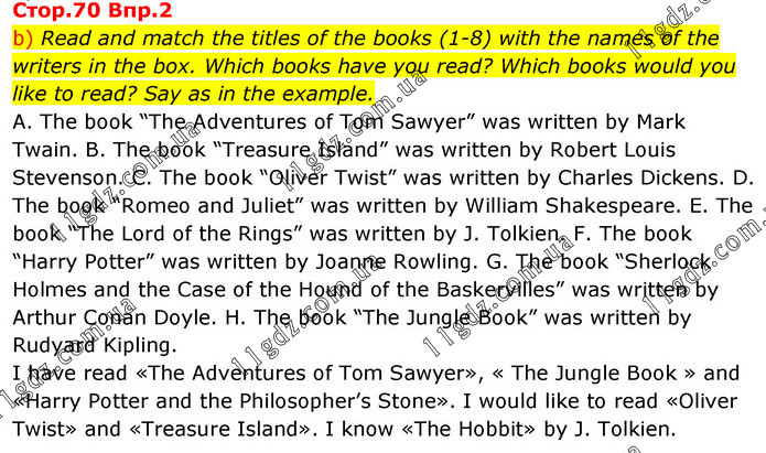 b) Read and match the titles of the books (1-8) with the names of the writers in the box. Which books have you read? Which books would you like to read? Say as in the example. A. The book “The Adventures of Tom Sawyer” was written by Mark Twain. B. The book “Treasure Island” was written by Robert Louis Stevenson. С. The book “Oliver Twist” was written by Charles Dickens. D. The book “Romeo and Juliet” was written by William Shakespeare. E. The book “The Lord of the Rings” was written by J. Tolkien. F. The book “Harry Potter” was written by Joanne Rowling. G. The book “Sherlock Holmes and the Case of the Hound of the Baskervilles” was written by Arthur Conan Doyle. H. The book “The Jungle Book” was written by Rudyard Kipling. I have read «The Adventures of Tom Sawyer», « The Jungle Book » and «Harry Potter and the Philosopher’s Stone». I would like to read «Oliver Twist» and «Treasure Island». I know «The Hobbit» by J. Tolkien.