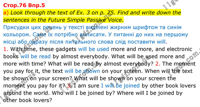 a) Look through the text of Ex. 3 on p. 75. Find and write down the sentences in the Future Simple Passive Voice. Присудки цих речень у тексті виділені жирним шрифтом та синім кольором. Саме їх потрібно виписати. У питанні до них на першому місці або одразу після питального слова слід поставити will. 1. With time, these gadgets will be used more and more, and electronic books will be read by almost everybody. What will be used more and more with time? What will be read by almost everybody? 2. The moment you pay for it, the text will be shown on your screen. When will the text be shown on your screen? What will be shown on your screen the moment you pay for it? 3. I am sure I will be joined by other book lovers around the world. Who will I be joined by? Where will I be joined by other book lovers?