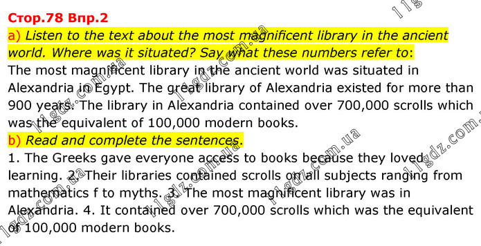 a) Listen to the text about the most magnificent library in the ancient world. Where was it situated? Say what these numbers refer to: The most magnificent library in the ancient world was situated in Alexandria in Egypt. The great library of Alexandria existed for more than 900 years. The library in Alexandria contained over 700,000 scrolls which was the equivalent of 100,000 modern books. b) Read and complete the sentences. 1. The Greeks gave everyone access to books because they loved learning. 2. Their libraries contained scrolls on all subjects ranging from mathematics f to myths. 3. The most magnificent library was in Alexandria. 4. It contained over 700,000 scrolls which was the equivalent of 100,000 modern books.
