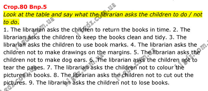 Look at the table and say what the librarian asks the children to do / not to do. 1. The librarian asks the children to return the books in time. 2. The librarian asks the children to keep the books clean and tidy. 3. The librarian asks the children to use book marks. 4. The librarian asks the children not to make drawings on the margins. 5. The librarian asks the children not to make dog ears. 6. The librarian asks the children not to tear the pages. 7. The librarian asks the children not to colour the pictures in books. 8. The librarian asks the children not to cut out the pictures. 9. The librarian asks the children not to lose books.