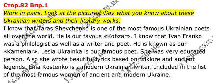 Work in pairs. Look at the pictures. Say what you know about these Ukrainian writers and their literary works. I know that Taras Shevchenko is one of the most famous Ukrainian poets all over the world. He is our favous «Kobzar». I know that Ivan Franko was a philologist as well as a writer and poet. He is known as our «Kameniar». Lesia Ukrainka is our famous poet. She was very educated person. Also she wrote beautiful lyrics based on folklore and ancient legends. Lina Kostenko is a modern Ukrainian writer. Included in the list of the most famous women of ancient and modern Ukraine.
