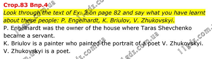 Look through the text of Ex. 2 on page 82 and say what you have learnt about these people: P. Engelhardt, K. Briulov, V. Zhukovskyi. P. Engelhardt was the owner of the house where Taras Shevchenko became a servant. K. Briulov is a painter who painted the portrait of a poet V. Zhukovskyi. V. Zhukovskyi is a poet.