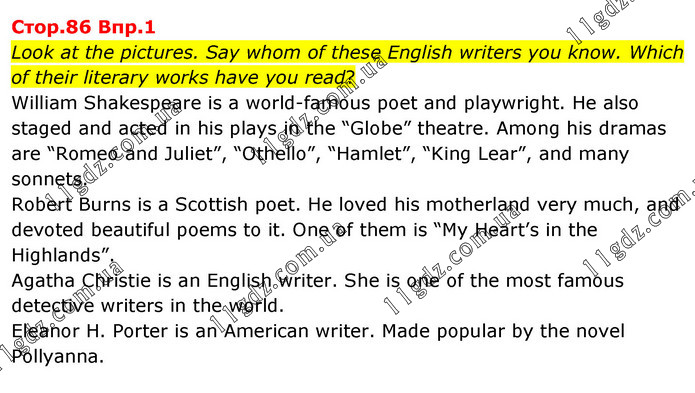 Look at the pictures. Say whom of these English writers you know. Which of their literary works have you read? William Shakespeare is a world-famous poet and playwright. He also staged and acted in his plays in the “Globe” theatre. Among his dramas are “Romeo and Juliet”, “Othello”, “Hamlet”, “King Lear”, and many sonnets. Robert Burns is a Scottish poet. He loved his motherland very much, and devoted beautiful poems to it. One of them is “My Heart’s in the Highlands”. Agatha Christie is an English writer. She is one of the most famous detective writers in the world. Eleanor H. Porter is an American writer. Made popular by the novel Pollyanna.