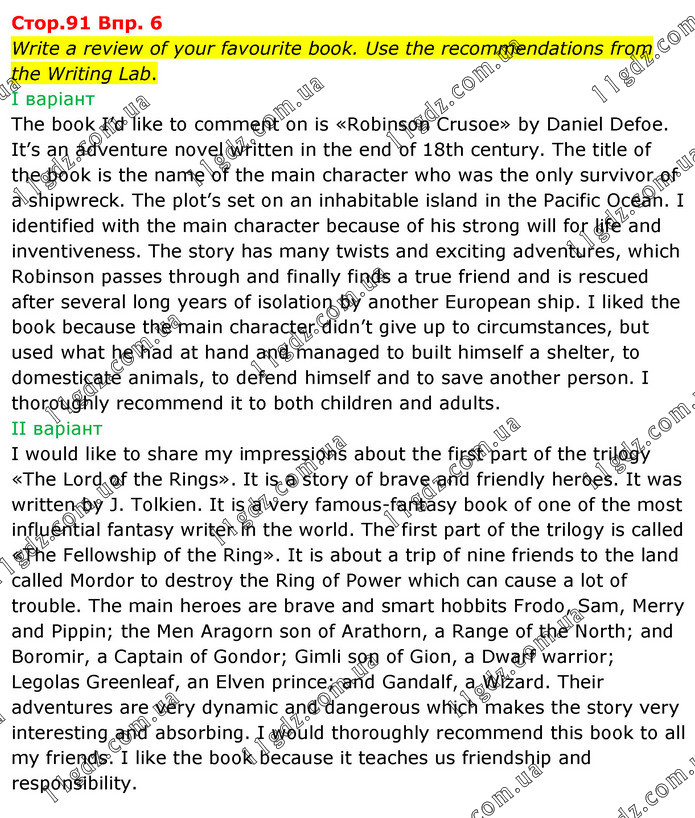 Write a review of your favourite book. Use the recommendations from the Writing Lab. І варіант The book I’d like to comment on is «Robinson Crusoe» by Daniel Defoe. It’s an adventure novel written in the end of 18th century. The title of the book is the name of the main character who was the only survivor of a shipwreck. The plot’s set on an inhabitable island in the Pacific Ocean. I identified with the main character because of his strong will for life and inventiveness. The story has many twists and exciting adventures, which Robinson passes through and finally finds a true friend and is rescued after several long years of isolation by another European ship. I liked the book because the main character didn’t give up to circumstances, but used what he had at hand and managed to built himself a shelter, to domesticate animals, to defend himself and to save another person. I thoroughly recommend it to both children and adults. ІІ варіант I would like to share my impressions about the first part of the trilogy «The Lord of the Rings». It is a story of brave and friendly heroes. It was written by J. Tolkien. It is a very famous-fantasy book of one of the most influential fantasy writer in the world. The first part of the trilogy is called «The Fellowship of the Ring». It is about a trip of nine friends to the land called Mordor to destroy the Ring of Power which can cause a lot of trouble. The main heroes are brave and smart hobbits Frodo, Sam, Merry and Pippin; the Men Aragorn son of Arathorn, a Range of the North; and Boromir, a Captain of Gondor; Gimli son of Gion, a Dwarf warrior; Legolas Greenleaf, an Elven prince; and Gandalf, a Wizard. Their adventures are very dynamic and dangerous which makes the story very interesting and absorbing. I would thoroughly recommend this book to all my friends. I like the book because it teaches us friendship and responsibility.