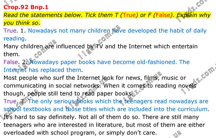 Read the statements below. Tick them T (True) or F (False). Explain why you think so. True. 1. Nowadays not many children have developed the habit of daily reading. Many children are influenced by TV and the Internet which entertain them. False. 2. Nowadays paper books have become old-fashioned. The Internet has replaced them. Most people who surf the Internet look for news, films, music or communicating in social networks. When it comes to reading novels though, people still tend to read paper books. True. 3. The only serious books which the teenagers read nowadays are school textbooks and those titles which are included into the curriculum. It’s hard to say definitely. Not all of them do so. There are still many teenagers who are interested in literature, but most of them are either overloaded with school program, or simply don’t care.