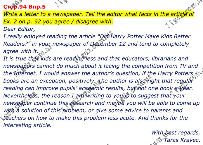 Write a letter to a newspaper. Tell the editor what facts in the article of Ex. 2 on p. 92 you agree / disagree with. Dear Editor, I really enjoyed reading the article “Did Harry Potter Make Kids Better Readers?” in your newspaper of December 12 and tend to completely agree with it. It is true that kids are reading less and that educators, librarians and newspapers cannot do much about it facing the competition from TV and the Internet. I would answer the author’s question, if the Harry Potters books are an exception, positively. The author is also right that regular reading can improve pupils’ academic results, but not one book a year. Nevertheless, the reason I am writing to you is to suggest that your newspaper continue this research and maybe you will be able to come up with a solution of this problem, or give some advice to parents and teachers on how to make this problem less acute. And thanks for the interesting article. With best regards, Taras Kravec.