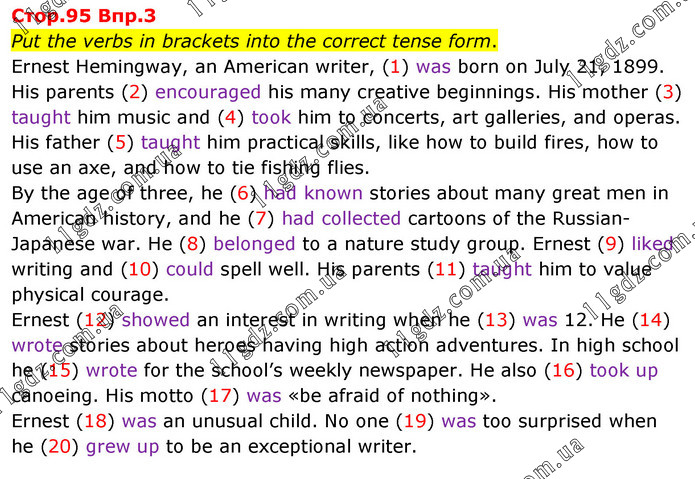 Put the verbs in brackets into the correct tense form. Ernest Hemingway, an American writer, (1) was born on July 21, 1899. His parents (2) encouraged his many creative beginnings. His mother (3) taught him music and (4) took him to concerts, art galleries, and operas. His father (5) taught him practical skills, like how to build fires, how to use an axe, and how to tie fishing flies. By the age of three, he (6) had known stories about many great men in American history, and he (7) had collected cartoons of the Russian-Japanese war. He (8) belonged to a nature study group. Ernest (9) liked writing and (10) could spell well. His parents (11) taught him to value physical courage. Ernest (12) showed an interest in writing when he (13) was 12. He (14) wrote stories about heroes having high action adventures. In high school he (15) wrote for the school’s weekly newspaper. He also (16) took up canoeing. His motto (17) was «be afraid of nothing». Ernest (18) was an unusual child. No one (19) was too surprised when he (20) grew up to be an exceptional writer.