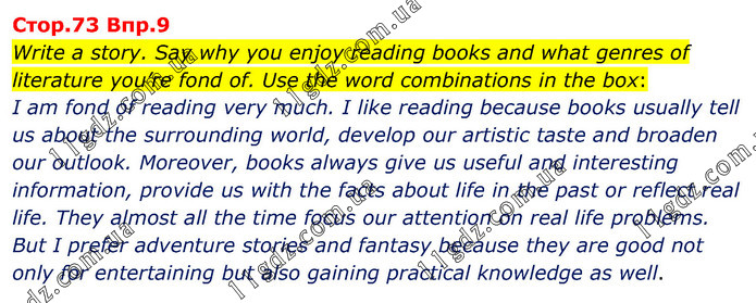 Write a story. Say why you enjoy reading books and what genres of literature you’re fond of. Use the word combinations in the box: I am fond of reading very much. I like reading because books usually tell us about the surrounding world, develop our artistic taste and broaden our outlook. Moreover, books always give us useful and interesting information, provide us with the facts about life in the past or reflect real life. They almost all the time focus our attention on real life problems. But I prefer adventure stories and fantasy because they are good not only for entertaining but also gaining practical knowledge as well.