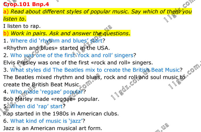 a) Read about different styles of popular music. Say which of them you listen to. I listen to rap. b) Work in pairs. Ask and answer the questions. 1. Where did ‘rhythm and blues’ start? «Rhythm and blues» started in the USA. 2. Who was one of the first ‘rock and roll’ singers? Elvis Presley was one of the first «rock and roll» singers. 3. What styles did The Beatles mix to create the British Beat Music? The Beatles mixed rhythm and blues, rock and roll and soul music to create the British Beat Music. 4. Who made ‘reggae’ popular? Bob Marley made «reggae» popular. 5. When did ‘rap’ start? Rap started in the 1980s in American clubs. 6. What kind of music is ‘jazz’? Jazz is an American musical art form.