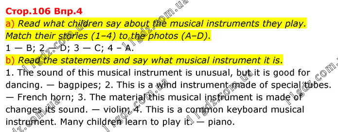 a) Read what children say about the musical instruments they play. Match their stories (1–4) to the photos (A–D). 1 — B; 2 — D; 3 — C; 4 – A. b) Read the statements and say what musical instrument it is. 1. The sound of this musical instrument is unusual, but it is good for dancing. — bagpipes; 2. This is a wind instrument made of special tubes. — French horn; 3. The material this musical instrument is made of changes its sound. — violin; 4. This is a common keyboard musical instrument. Many children learn to play it. — piano.