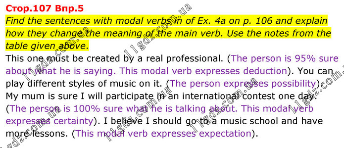 Find the sentences with modal verbs in of Ex. 4a on p. 106 and explain how they change the meaning of the main verb. Use the notes from the table given above. This one must be created by a real professional. (The person is 95% sure about what he is saying. This modal verb expresses deduction). You can play different styles of music on it. (The person expresses possibility). My mum is sure I will participate in an international contest one day. (The person is 100% sure what he is talking about. This modal verb expresses certainty). I believe I should go to a music school and have more lessons. (This modal verb expresses expectation).