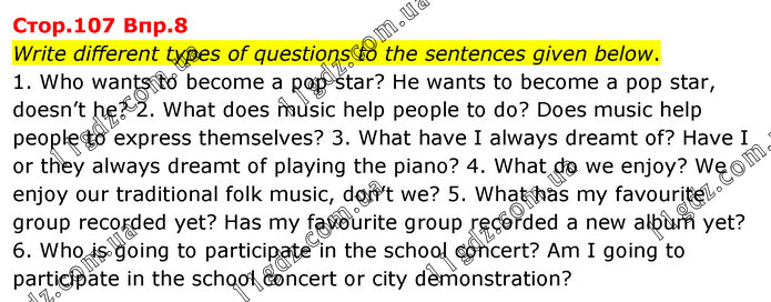 Write different types of questions to the sentences given below. 1. Who wants to become a pop star? He wants to become a pop star, doesn’t he? 2. What does music help people to do? Does music help people to express themselves? 3. What have I always dreamt of? Have I or they always dreamt of playing the piano? 4. What do we enjoy? We enjoy our traditional folk music, don’t we? 5. What has my favourite group recorded yet? Has my favourite group recorded a new album yet? 6. Who is going to participate in the school concert? Am I going to participate in the school concert or city demonstration?