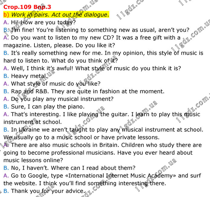 b) Work in pairs. Act out the dialogue. A. Hi! How are you today? B. I’m fine! You’re listening to something new as usual, aren’t you? A. Do you want to listen to my new CD? It was a free gift with a magazine. Listen, please. Do you like it? B. It’s really something new for me. In my opinion, this style of music is hard to listen to. What do you think of it? A. Well, I think it’s awful! What style of music do you think it is? B. Heavy metal. A. What style of music do you like? B. Rap and R&B. They are quite in fashion at the moment. A. Do you play any musical instrument? B. Sure, I can play the piano. A. That’s interesting. I like playing the guitar. I learn to play this music instrument at school. B. In Ukraine we aren’t taught to play any musical instrument at school. We usually go to a music school or have private lessons. A. There are also music schools in Britain. Children who study there are going to become professional musicians. Have you ever heard about music lessons online? B. No, I haven’t. Where can I read about them? A. Go to Google, type «International Internet Music Academy» and surf the website. I think you’ll find something interesting there. B. Thank you for your advice.