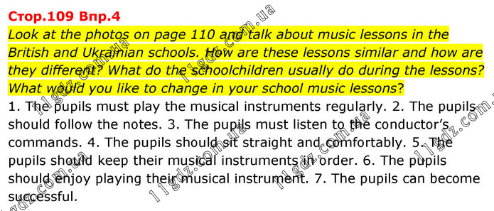 Look at the photos on page 110 and talk about music lessons in the British and Ukrainian schools. How are these lessons similar and how are they different? What do the schoolchildren usually do during the lessons? What would you like to change in your school music lessons? 1. The pupils must play the musical instruments regularly. 2. The pupils should follow the notes. 3. The pupils must listen to the conductor’s commands. 4. The pupils should sit straight and comfortably. 5. The pupils should keep their musical instruments in order. 6. The pupils should enjoy playing their musical instrument. 7. The pupils can become successful.