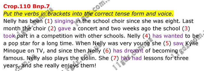 Put the verbs in brackets into the correct tense form and voice. Nelly has been (1) singing in the school choir since she was eight. Last month the choir (2) gave a concert and two weeks ago the school (3) took part in a competition with other schools. Nelly (4) has wanted to be a pop star for a long time. When Nelly was very young she (5) saw Kylie Minogue on TV, and since then Nelly (6) has dreamt of becoming famous. Nelly also plays the violin. She (7) has had lessons for three years, and she really enjoys them!