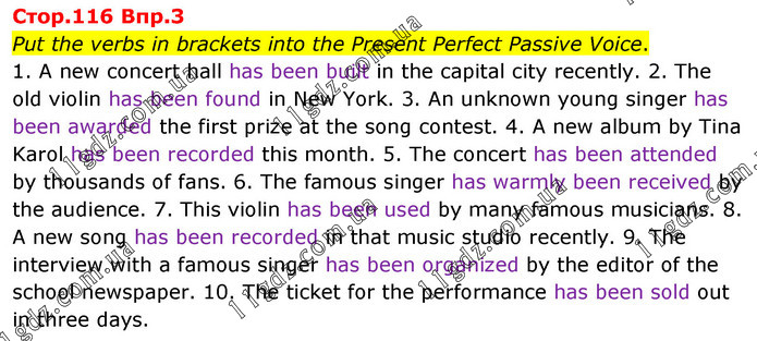 Put the verbs in brackets into the Present Perfect Passive Voice. 1. A new concert hall has been built in the capital city recently. 2. The old violin has been found in New York. 3. An unknown young singer has been awarded the first prize at the song contest. 4. A new album by Tina Karol has been recorded this month. 5. The concert has been attended by thousands of fans. 6. The famous singer has warmly been received by the audience. 7. This violin has been used by many famous musicians. 8. A new song has been recorded in that music studio recently. 9. The interview with a famous singer has been organized by the editor of the school newspaper. 10. The ticket for the performance has been sold out in three days.