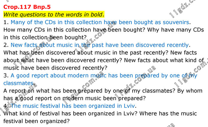 Write questions to the words in bold. 1. Many of the CDs in this collection have been bought as souvenirs. How many CDs in this collection have been bought? Why have many CDs in this collection been bought? 2. New facts about music in the past have been discovered recently. What has been discovered about music in the past recently? New facts about what have been discovered recently? New facts about what kind of music have been discovered recently? 3. A good report about modern music has been prepared by one of my classmates. A report on what has been prepared by one of my classmates? By whom has a good report on modern music been prepared? 4. The music festival has been organized in Lviv. What kind of festival has been organized in Lviv? Where has the music festival been organized?