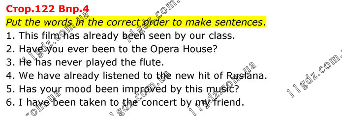 Put the words in the correct order to make sentences. 1. This film has already been seen by our class. 2. Have you ever been to the Opera House? 3. He has never played the flute. 4. We have already listened to the new hit of Ruslana. 5. Has your mood been improved by this music? 6. I have been taken to the concert by my friend.