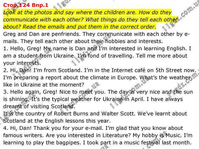 Look at the photos and say where the children are. How do they communicate with each other? What things do they tell each other about? Read the emails and put them in the correct order. Greg and Dan are penfriends. They communicate with each other by e-mails. They tell each other about their hobbies and interests. 1. Hello, Greg! My name is Dan and I’m interested in learning English. I am a student from Ukraine. I’m fond of travelling. Tell me more about your interests. 2. Hi, Dan! I’m from Scotland. I’m in the Internet café on 5th Street now. I’m preparing a report about the climate in Europe. What’s the weather like in Ukraine at the moment? 3. Hello again, Greg! Nice to meet you. The day is very nice and the sun is shining. It’s the typical weather for Ukraine in April. I have always dreamt of visiting Scotland. It is the country of Robert Burns and Walter Scott. We’ve learnt about Scotland at the English lessons this year. 4. Hi, Dan! Thank you for your e-mail. I’m glad that you know about famous writers. Are you interested in Literature? My hobby is Music. I’m learning to play the bagpipes. I took part in a music festival last month.
