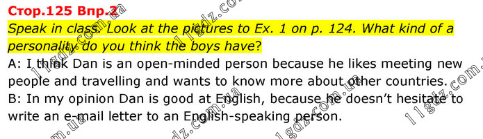 Speak in class. Look at the pictures to Ex. 1 on p. 124. What kind of a personality do you think the boys have? A: I think Dan is an open-minded person because he likes meeting new people and travelling and wants to know more about other countries. В: In my opinion Dan is good at English, because he doesn’t hesitate to write an e-mail letter to an English-speaking person.