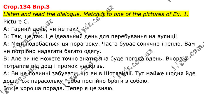 Listen and read the dialogue. Match it to one of the pictures of Ex. 1. Picture C. A: Гарний день, чи не так? B: Так, це так. Це ідеальний день для перебування на вулиці! A: Мені подобається ця пора року. Часто буває сонячно і тепло. Вам не потрібно надягати багато одягу. B: Але ви не можете точно знати, яка буде погода вдень. Вчора я потрапив під дощ і промок наскрізь. A: Ви не повинні забувати, що ви в Шотландії. Тут майже щодня йде дощ. Тож парасольку треба постійно брати з собою. B: Це хороша порада. Тепер я це знаю.