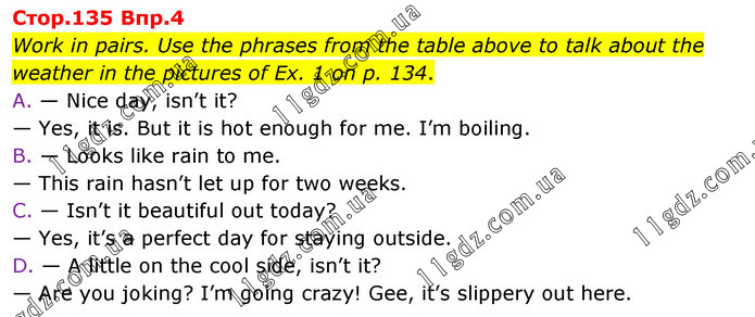 Work in pairs. Use the phrases from the table above to talk about the weather in the pictures of Ex. 1 on p. 134. A. — Nice day, isn’t it? — Yes, it is. But it is hot enough for me. I’m boiling. B. — Looks like rain to me. — This rain hasn’t let up for two weeks. C. — Isn’t it beautiful out today? — Yes, it’s a perfect day for staying outside. D. — A little on the cool side, isn’t it? — Are you joking? I’m going crazy! Gee, it’s slippery out here.