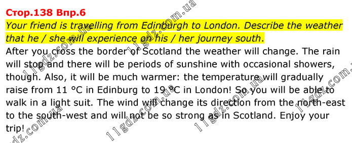 Your friend is travelling from Edinburgh to London. Describe the weather that he / she will experience on his / her journey south. After you cross the border of Scotland the weather will change. The rain will stop and there will be periods of sunshine with occasional showers, though. Also, it will be much warmer: the temperature will gradually raise from 11 °С in Edinburg to 19 °С in London! So you will be able to walk in a light suit. The wind will change its direction from the north-east to the south-west and will not be so strong as in Scotland. Enjoy your trip!