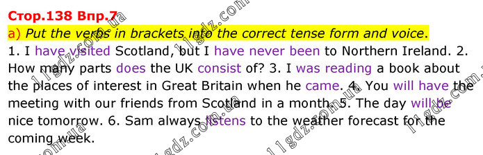 a) Put the verbs in brackets into the correct tense form and voice. 1. I have visited Scotland, but I have never been to Northern Ireland. 2. How many parts does the UK consist of? 3. I was reading a book about the places of interest in Great Britain when he came. 4. You will have the meeting with our friends from Scotland in a month. 5. The day will be nice tomorrow. 6. Sam always listens to the weather forecast for the coming week.