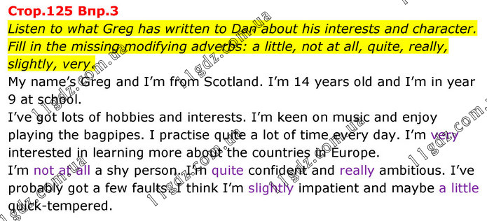 Listen to what Greg has written to Dan about his interests and character. Fill in the missing modifying adverbs: a little, not at all, quite, really, slightly, very. My name’s Greg and I’m from Scotland. I’m 14 years old and I’m in year 9 at school. I’ve got lots of hobbies and interests. I’m keen on music and enjoy playing the bagpipes. I practise quite a lot of time every day. I’m very interested in learning more about the countries in Europe. I’m not at all a shy person. I’m quite confident and really ambitious. I’ve probably got a few faults. I think I’m slightly impatient and maybe a little quick-tempered.