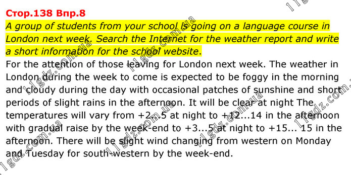A group of students from your school is going on a language course in London next week. Search the Internet for the weather report and write a short information for the school website. For the attention of those leaving for London next week. The weather in London during the week to come is expected to be foggy in the morning and cloudy during the day with occasional patches of sunshine and short periods of slight rains in the afternoon. It will be clear at night The temperatures will vary from +2...5 at night to +12...14 in the afternoon with gradual raise by the week-end to +3...5 at night to +15... 15 in the afternoon. There will be slight wind changing from western on Monday and Tuesday for south-western by the week-end.