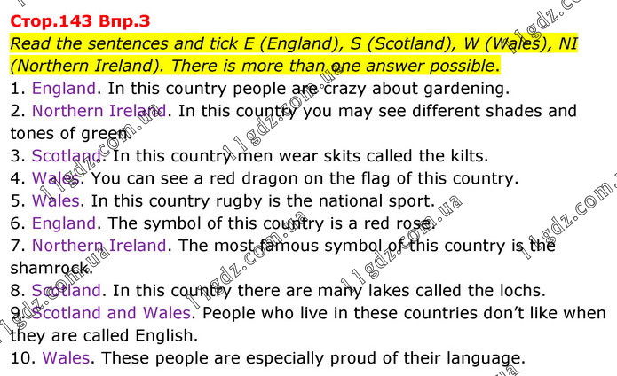 Read the sentences and tick E (England), S (Scotland), W (Wales), NI (Northern Ireland). There is more than one answer possible. 1. England. In this country people are crazy about gardening. 2. Northern Ireland. In this country you may see different shades and tones of green. 3. Scotland. In this country men wear skits called the kilts. 4. Wales. You can see a red dragon on the flag of this country. 5. Wales. In this country rugby is the national sport. 6. England. The symbol of this country is a red rose. 7. Northern Ireland. The most famous symbol of this country is the shamrock. 8. Scotland. In this country there are many lakes called the lochs. 9. Scotland and Wales. People who live in these countries don’t like when they are called English. 10. Wales. These people are especially proud of their language.