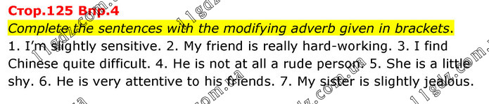 Complete the sentences with the modifying adverb given in brackets. 1. I’m slightly sensitive. 2. My friend is really hard-working. 3. I find Chinese quite difficult. 4. He is not at all a rude person. 5. She is a little shy. 6. He is very attentive to his friends. 7. My sister is slightly jealous.