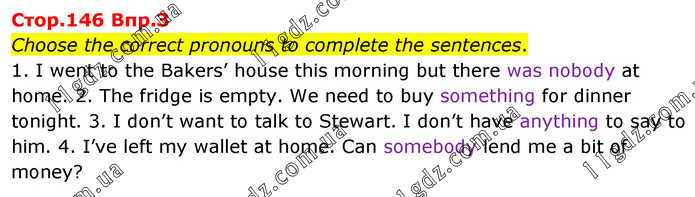Choose the correct pronouns to complete the sentences. 1. I went to the Bakers’ house this morning but there was nobody at home. 2. The fridge is empty. We need to buy something for dinner tonight. 3. I don’t want to talk to Stewart. I don’t have anything to say to him. 4. I’ve left my wallet at home. Can somebody lend me a bit of money?