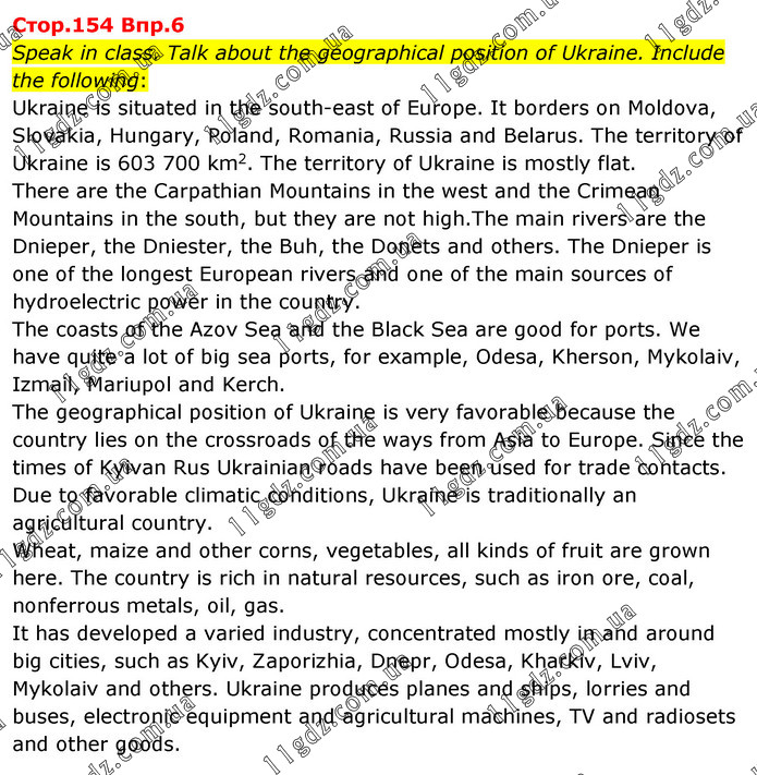 Speak in class. Talk about the geographical position of Ukraine. Include the following: Ukraine is situated in the south-east of Europe. It borders on Moldova, Slovakia, Hungary, Poland, Romania, Russia and Belarus. The territory of Ukraine is 603 700 km2. The territory of Ukraine is mostly flat. There are the Carpathian Mountains in the west and the Crimean Mountains in the south, but they are not high.The main rivers are the Dnieper, the Dniester, the Buh, the Donets and others. The Dnieper is one of the longest European rivers and one of the main sources of hydroelectric power in the country. The coasts of the Azov Sea and the Black Sea are good for ports. We have quite a lot of big sea ports, for example, Odesa, Kherson, Mykolaiv, Izmail, Mariupol and Kerch. The geographical position of Ukraine is very favorable because the country lies on the crossroads of the ways from Asia to Europe. Since the times of Kyivan Rus Ukrainian roads have been used for trade contacts. Due to favorable climatic conditions, Ukraine is traditionally an agricultural country. Wheat, maize and other corns, vegetables, all kinds of fruit are grown here. The country is rich in natural resources, such as iron ore, coal, nonferrous metals, oil, gas. It has developed a varied industry, concentrated mostly in and around big cities, such as Kyiv, Zaporizhia, Dnepr, Odesa, Kharkiv, Lviv, Mykolaiv and others. Ukraine produces planes and ships, lorries and buses, electronic equipment and agricultural machines, TV and radiosets and other goods.