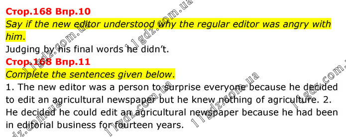 Стор.168 Впр.10 Say if the new editor understood why the regular editor was angry with him. Judging by his final words he didn’t. Стор.168 Впр.11 Complete the sentences given below. 1. The new editor was a person to surprise everyone because he decided to edit an agricultural newspaper but he knew nothing of agriculture. 2. He decided he could edit an agricultural newspaper because he had been in editorial business for fourteen years.