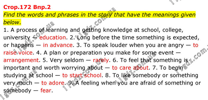 Find the words and phrases in the story that have the meanings given below. 1. A process of learning and getting knowledge at school, college, university — education. 2. Long before the time something is expected, or happens — in advance. 3. To speak louder when you are angry — to raise voice. 4. A plan or preparation you make for some event — arrangement. 5. Very seldom — rarely. 6. To feel that something is important and worth worrying about — to care about. 7. To begin studying at school — to start school. 8. To like somebody or something very much — to adore. 9. A feeling when you are afraid of something or somebody — fear.
