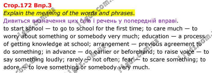 Explain the meaning of the words and phrases. Дивиться визначення цих слів і речень у попередній вправі. to start school — to go to school for the first time; to care much — to worry about something or somebody very much; education — a process of getting knowledge at school; arrangement — previous agreement to do something; in advance — do earlier or beforehand; to raise voice — to say something loudly; rarely — not often; fear — to scare something; to adore — to love something or somebody very much.