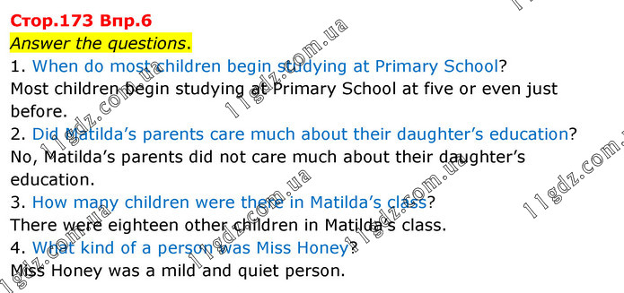 Answer the questions. 1. When do most children begin studying at Primary School? Most children begin studying at Primary School at five or even just before. 2. Did Matilda’s parents care much about their daughter’s education? No, Matilda’s parents did not care much about their daughter’s education. 3. How many children were there in Matilda’s class? There were eighteen other children in Matilda’s class. 4. What kind of a person was Miss Honey? Miss Honey was a mild and quiet person.