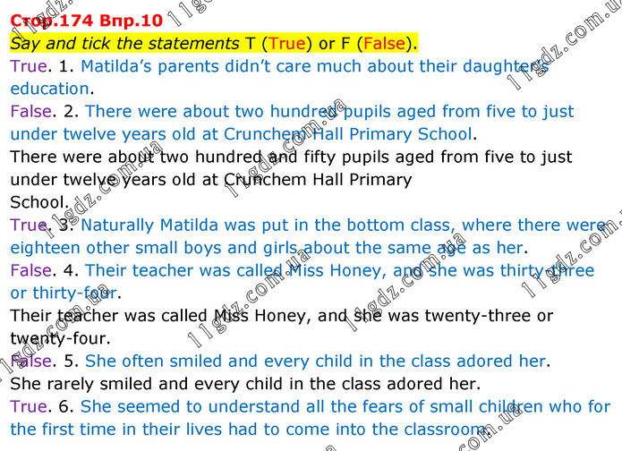 Say and tick the statements T (True) or F (False). True. 1. Matilda’s parents didn’t care much about their daughter’s education. False. 2. There were about two hundred pupils aged from five to just under twelve years old at Crunchem Hall Primary School. There were about two hundred and fifty pupils aged from five to just under twelve years old at Crunchem Hall Primary School. True. 3. Naturally Matilda was put in the bottom class, where there were eighteen other small boys and girls about the same age as her. False. 4. Their teacher was called Miss Honey, and she was thirty-three or thirty-four. Their teacher was called Miss Honey, and she was twenty-three or twenty-four. False. 5. She often smiled and every child in the class adored her. She rarely smiled and every child in the class adored her. True. 6. She seemed to understand all the fears of small children who for the first time in their lives had to come into the classroom.