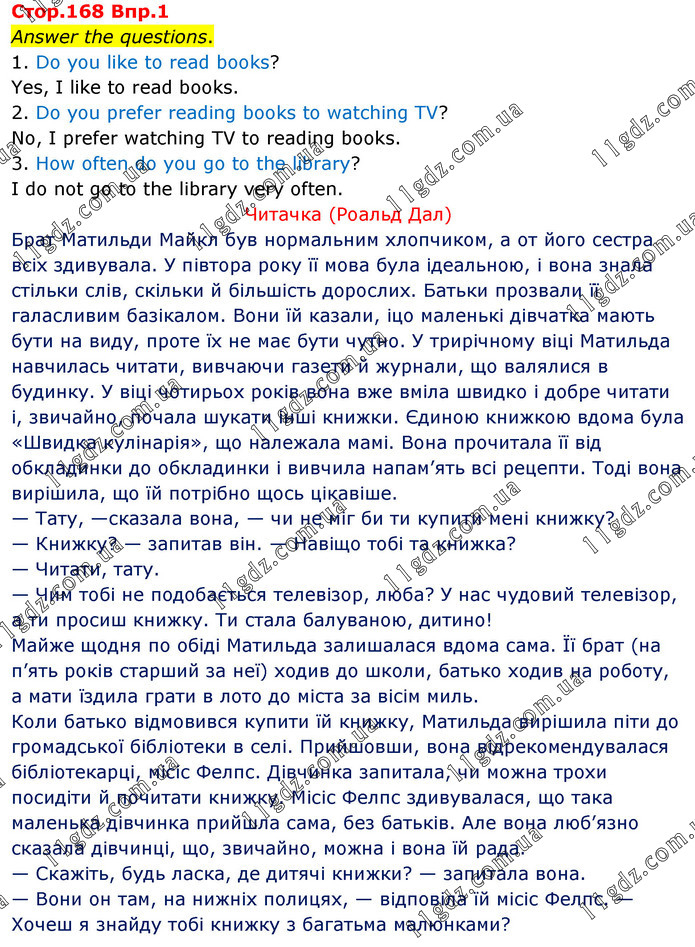 Answer the questions. 1. Do you like to read books? Yes, I like to read books. 2. Do you prefer reading books to watching TV? No, I prefer watching TV to reading books. 3. How often do you go to the library? I do not go to the library very often. Читачка (Роальд Дал) Брат Матильди Майкл був нормальним хлопчиком, а от його сестра всіх здивувала. У півтора року її мова була ідеальною, і вона знала стільки слів, скільки й більшість дорослих. Батьки прозвали її галасливим базікалом. Вони їй казали, іцо маленькі дівчатка мають бути на виду, проте їх не має бути чутно. У трирічному віці Матильда навчилась читати, вивчаючи газети й журнали, що валялися в будинку. У віці чотирьох років вона вже вміла швидко і добре читати і, звичайно, почала шукати інші книжки. Єдиною книжкою вдома була «Швидка кулінарія», що належала мамі. Вона прочитала її від обкладинки до обкладинки і вивчила напам’ять всі рецепти. Тоді вона вирішила, що їй потрібно щось цікавіше. — Тату, —сказала вона, — чи не міг би ти купити мені книжку? — Книжку? — запитав він. — Навіщо тобі та книжка? — Читати, тату. — Чим тобі не подобається телевізор, люба? У нас чудовий телевізор, а ти просиш книжку. Ти стала балуваною, дитино! Майже щодня по обіді Матильда залишалася вдома сама. Її брат (на п’ять років старший за неї) ходив до школи, батько ходив на роботу, а мати їздила грати в лото до міста за вісім миль. Коли батько відмовився купити їй книжку, Матильда вирішила піти до громадської бібліотеки в селі. Прийшовши, вона відрекомендувалася бібліотекарці, місіс Фелпс. Дівчинка запитала, чи можна трохи посидіти й почитати книжку. Місіс Фелпс здивувалася, що така маленька дівчинка прийшла сама, без батьків. Але вона люб’язно сказала дівчинці, що, звичайно, можна і вона їй рада. — Скажіть, будь ласка, де дитячі книжки? — запитала вона. — Вони он там, на нижніх полицях, — відповіла їй місіс Фелпс. — Хочеш я знайду тобі книжку з багатьма малюнками?