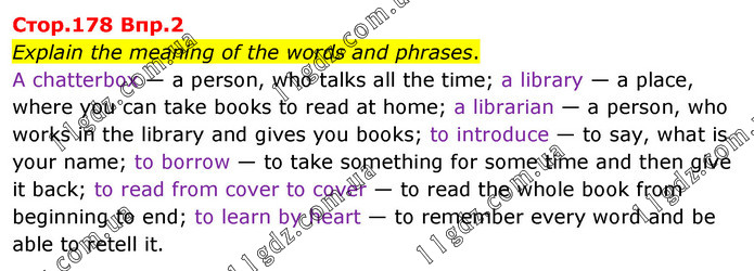Explain the meaning of the words and phrases. A chatterbox — a person, who talks all the time; a library — a place, where you can take books to read at home; a librarian — a person, who works in the library and gives you books; to introduce — to say, what is your name; to borrow — to take something for some time and then give it back; to read from cover to cover — to read the whole book from beginning to end; to learn by heart — to remember every word and be able to retell it.
