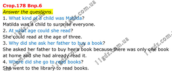 Answer the questions. 1. What kind of a child was Matilda? Matilda was a child to surprise everyone. 2. At what age could she read? She could read at the age of three. 3. Why did she ask her father to buy a book? She asked her father to buy her a book because there was only one book at home and she had already read it. 4. Where did she go to read books? She went to the library to read books.
