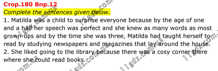 Complete the sentences given below. 1. Matilda was a child to surprise everyone because by the age of one and a half her speech was perfect and she knew as many words as most grown-ups and by the time she was three, Matilda had taught herself to read by studying newspapers and magazines that lay around the house. 2. She liked going to the library because there was a cosy corner there where she could read books.