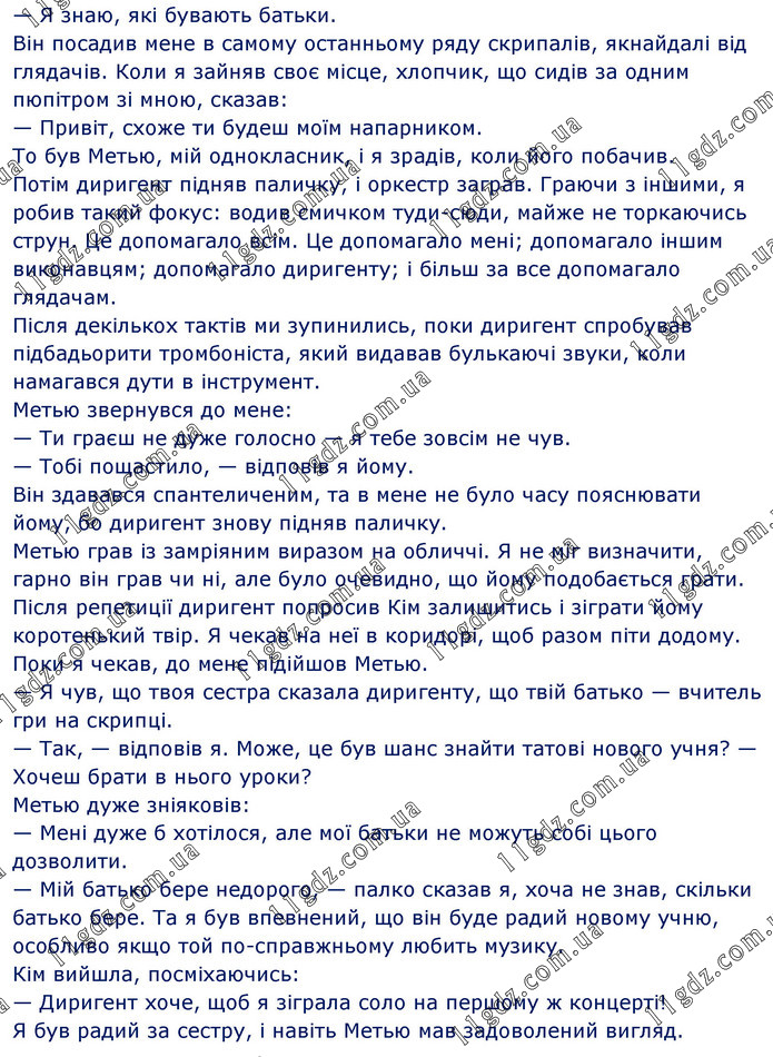 — Я знаю, які бувають батьки. Він посадив мене в самому останньому ряду скрипалів, якнайдалі від глядачів. Коли я зайняв своє місце, хлопчик, що сидів за одним пюпітром зі мною, сказав: — Привіт, схоже ти будеш моїм напарником. То був Метью, мій однокласник, і я зрадів, коли його побачив. Потім диригент підняв паличку, і оркестр заграв. Граючи з іншими, я робив такий фокус: водив смичком туди-сюди, майже не торкаючись струн. Це допомагало всім. Це допомагало мені; допомагало іншим виконавцям; допомагало диригенту; і більш за все допомагало глядачам. Після декількох тактів ми зупинились, поки диригент спробував підбадьорити тромбоніста, який видавав булькаючі звуки, коли намагався дути в інструмент. Метью звернувся до мене: — Ти граєш не дуже голосно — я тебе зовсім не чув. — Тобі пощастило, — відповів я йому. Він здавався спантеличеним, та в мене не було часу пояснювати йому, бо диригент знову підняв паличку. Метью грав із замріяним виразом на обличчі. Я не міг визначити, гарно він грав чи ні, але було очевидно, що йому подобається грати. Після репетиції диригент попросив Кім залишитись і зіграти йому коротенький твір. Я чекав на неї в коридорі, щоб разом піти додому. Поки я чекав, до мене підійшов Метью. — Я чув, що твоя сестра сказала диригенту, що твій батько — вчитель гри на скрипці. — Так, — відповів я. Може, це був шанс знайти татові нового учня? — Хочеш брати в нього уроки? Метью дуже зніяковів: — Мені дуже б хотілося, але мої батьки не можуть собі цього дозволити. — Мій батько бере недорого, — палко сказав я, хоча не знав, скільки батько бере. Та я був впевнений, що він буде радий новому учню, особливо якщо той по-справжньому любить музику. Кім вийшла, посміхаючись: — Диригент хоче, щоб я зіграла соло на першому ж концерті! Я був радий за сестру, і навіть Метью мав задоволений вигляд.