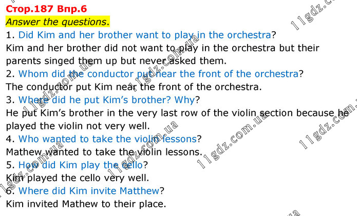 Answer the questions. 1. Did Kim and her brother want to play in the orchestra? Kim and her brother did not want to play in the orchestra but their parents singed them up but never asked them. 2. Whom did the conductor put near the front of the orchestra? The conductor put Kim near the front of the orchestra. 3. Where did he put Kim’s brother? Why? He put Kim’s brother in the very last row of the violin section because he played the violin not very well. 4. Who wanted to take the violin lessons? Mathew wanted to take the violin lessons. 5. How did Kim play the cello? Kim played the cello very well. 6. Where did Kim invite Matthew? Kim invited Mathew to their place.