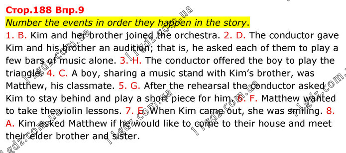 Number the events in order they happen in the story. 1. B. Kim and her brother joined the orchestra. 2. D. The conductor gave Kim and his brother an audition; that is, he asked each of them to play a few bars of music alone. 3. H. The conductor offered the boy to play the triangle. 4. C. A boy, sharing a music stand with Kim’s brother, was Matthew, his classmate. 5. G. After the rehearsal the conductor asked Kim to stay behind and play a short piece for him. 6. F. Matthew wanted to take the violin lessons. 7. E. When Kim came out, she was smiling. 8. A. Kim asked Matthew if he would like to come to their house and meet their elder brother and sister.