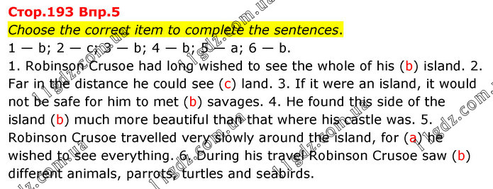 Choose the correct item to complete the sentences. 1 — b; 2 — c; 3 — b; 4 — b; 5 — a; 6 — b. 1. Robinson Crusoe had long wished to see the whole of his (b) island. 2. Far in the distance he could see (c) land. 3. If it were an island, it would not be safe for him to met (b) savages. 4. He found this side of the island (b) much more beautiful than that where his castle was. 5. Robinson Crusoe travelled very slowly around the island, for (a) he wished to see everything. 6. During his travel Robinson Crusoe saw (b) different animals, parrots, turtles and seabirds.