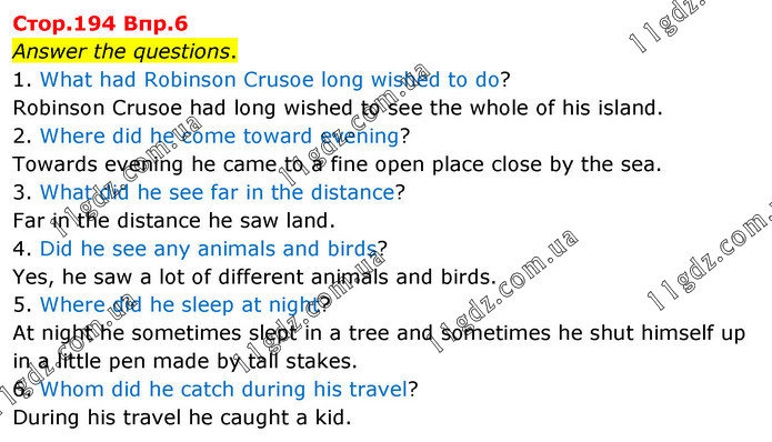 Answer the questions. 1. What had Robinson Crusoe long wished to do? Robinson Crusoe had long wished to see the whole of his island. 2. Where did he come toward evening? Towards evening he came to a fine open place close by the sea. 3. What did he see far in the distance? Far in the distance he saw land. 4. Did he see any animals and birds? Yes, he saw a lot of different animals and birds. 5. Where did he sleep at night? At night he sometimes slept in a tree and sometimes he shut himself up in a little pen made by tall stakes. 6. Whom did he catch during his travel? During his travel he caught a kid.
